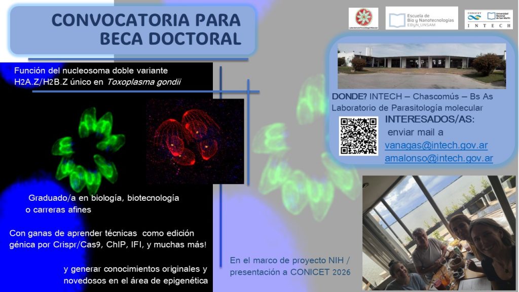 Durante la diferenciación celular se encienden y apagan genes en forma secuencial. Dada la dificultad de encontrar un amplio repertorio de factores de transcripción se cree que un aspecto importante en la regulación de la transcripción de genes asociados al desarrollo puede estar dado por mecanismos epigenéticos. Recientemente, en nuestro grupo de investigación se identificó la presencia de una variante para la familia H2B (llamada H2Bv y posteriormente H2B.Z) en T. gondii. Este aspecto resultó de gran interés ya que no existen variantes de H2Bs en eucariotas superiores, a excepción de algunas que sólo se expresan en gónadas. Posteriormente se observó que H2B.Z dimeriza específicamente con H2A.Z y se une a promotores activos o bivalentes. En cambio, la histona H2B canónica de T. gondii (H2Ba) dimeriza y colocaliza con la histona H2A.X en sitios silentes del genoma y más especialmente en la región subtelomérica. Ambas histonas, H2A.Z y H2B.Z se encuentran hiperacetiladas en el extremo N-terminal mientras que sus formas canónicas o la variante H2A.X no lo están. En la actualidad estamos analizando el rol de estas acetilaciones en la regulación de la expresión génica así como en la diferenciación taquizoito a bradizoito de T. gondii y en la modulación de la heterocromatina constitutiva.
