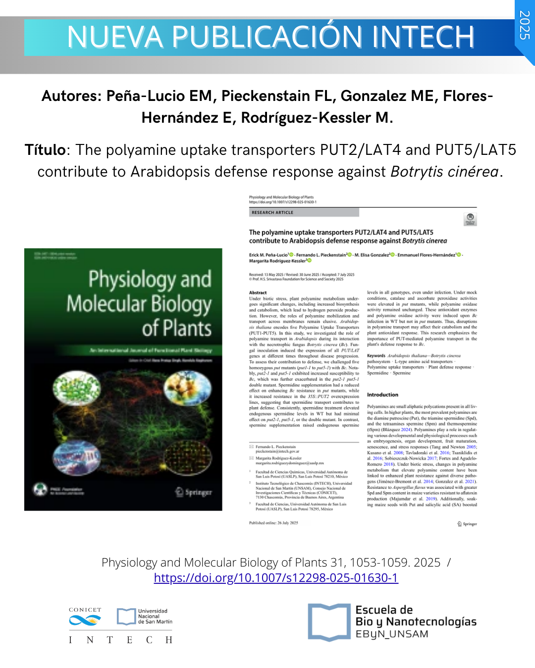 New publication: Nueva publicación: The polyamine uptake transporters PUT2/LAT4 and PUT5/LAT5 contribute to Arabidopsis defense response against Botrytis cinérea.