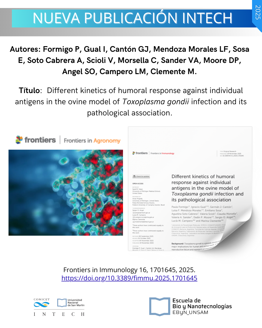 En este trabajo, investigamos la respuesta humoral de corderos infectados experimentalmente con dos cepas de T. gondii: una altamente virulenta (RH) y otra representativa de infecciones naturales (Me49), utilizando dos dosis distintas. Durante los 60 días posteriores a la infección se tomaron muestras seriadas de suero para evaluar anticuerpos contra cinco antígenos recombinantes del parásito: GRA4-GRA7, GRA8, ROP2, BCLA y CST9. Algunos de estos antígenos están asociados a la fase aguda (tachyzoítos) y otros a la fase crónica (formación de quistes tisulares). Paralelamente, se analizaron lesiones cerebrales mediante histopatología y se evaluó la utilidad diagnóstica de estos antígenos en sueros de ovejas naturalmente infectadas.
