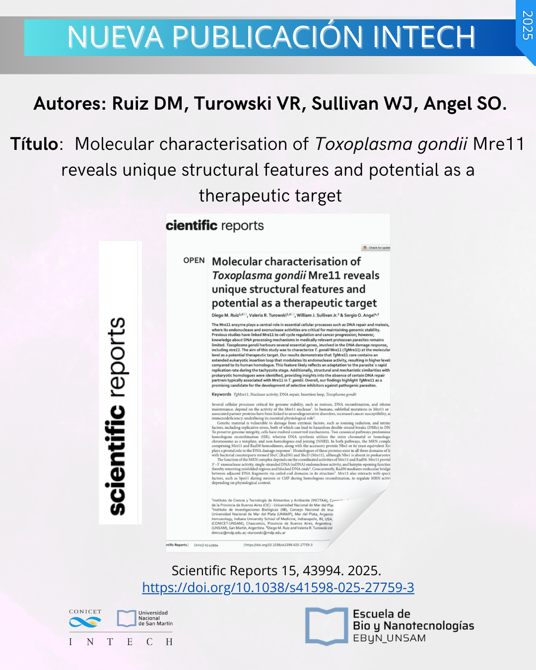 En conjunto, estos resultados identifican diferencias clave entre el parásito y el huésped. La región exclusiva de TgMre11 surge como un posible blanco terapéutico, abriendo nuevas perspectivas para el desarrollo de tratamientos antiparasitarios más específicos y seguros.